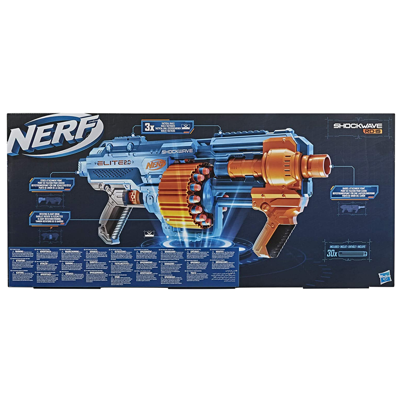 تفنگ Nerf SOCKWAVE ELITE 2.0 محصولی از برند امریکایی Hasbro می باشد و دارای 30 تیر فومی است که 15 تا از آنها به راحتی درون خشاب چرخشی اسلحه جای میگیرند. برای شلیک فقط کافیست تیرها را داخل خشاب بگذارید، گلنگدن را بکشید و ماشه را فشار دهید. عملکرد این تفنگ به صورت پمپی است و میتواند تیرها را تا برد 27 متر پرتاب کند. همچنین تفنگ Nerf SOCKWAVE ELITE 2.0 قابلیت اضافه کردن تجهیزات اضافه همانند قنداق را نیز دارد. متریال این تفنگ دارای استاندارد CE اروپا می باشد. شایان ذکر است این محصول مناسب سنین 8+ می باشد.